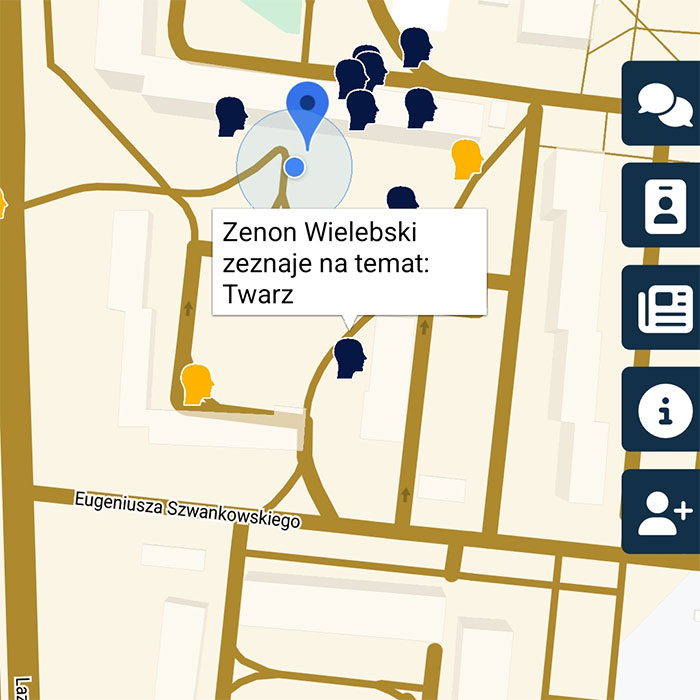 Pojedyncze kliknięcie na marker, pokazuje informację, kto składa zeznanie i na jaki temat, co umożliwia zaplanowanie kolejności przesłuchiwania świadków.